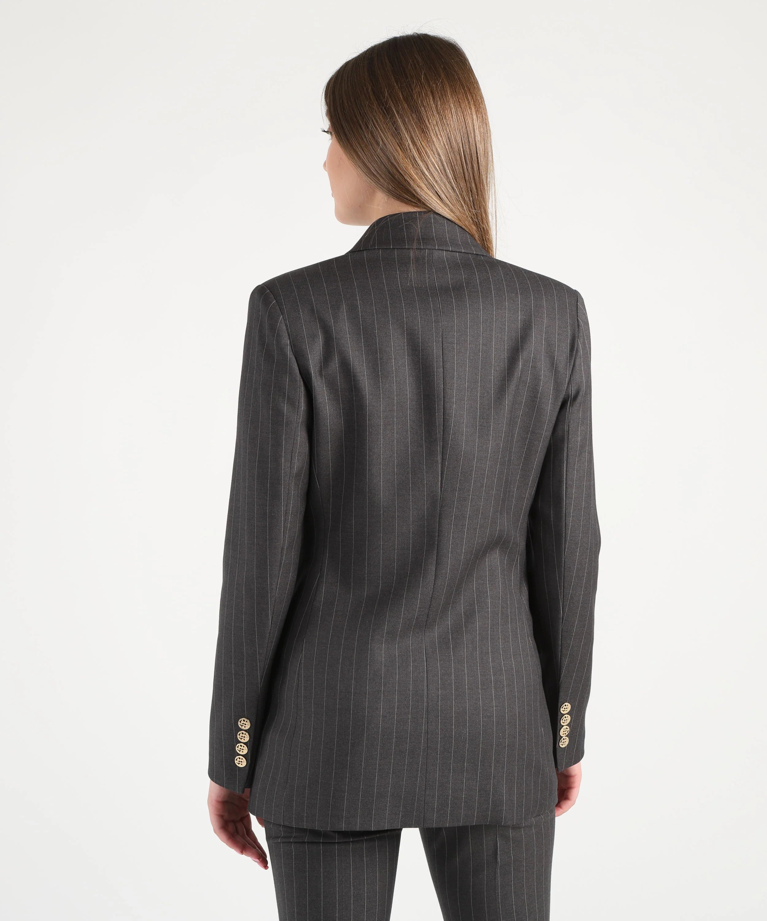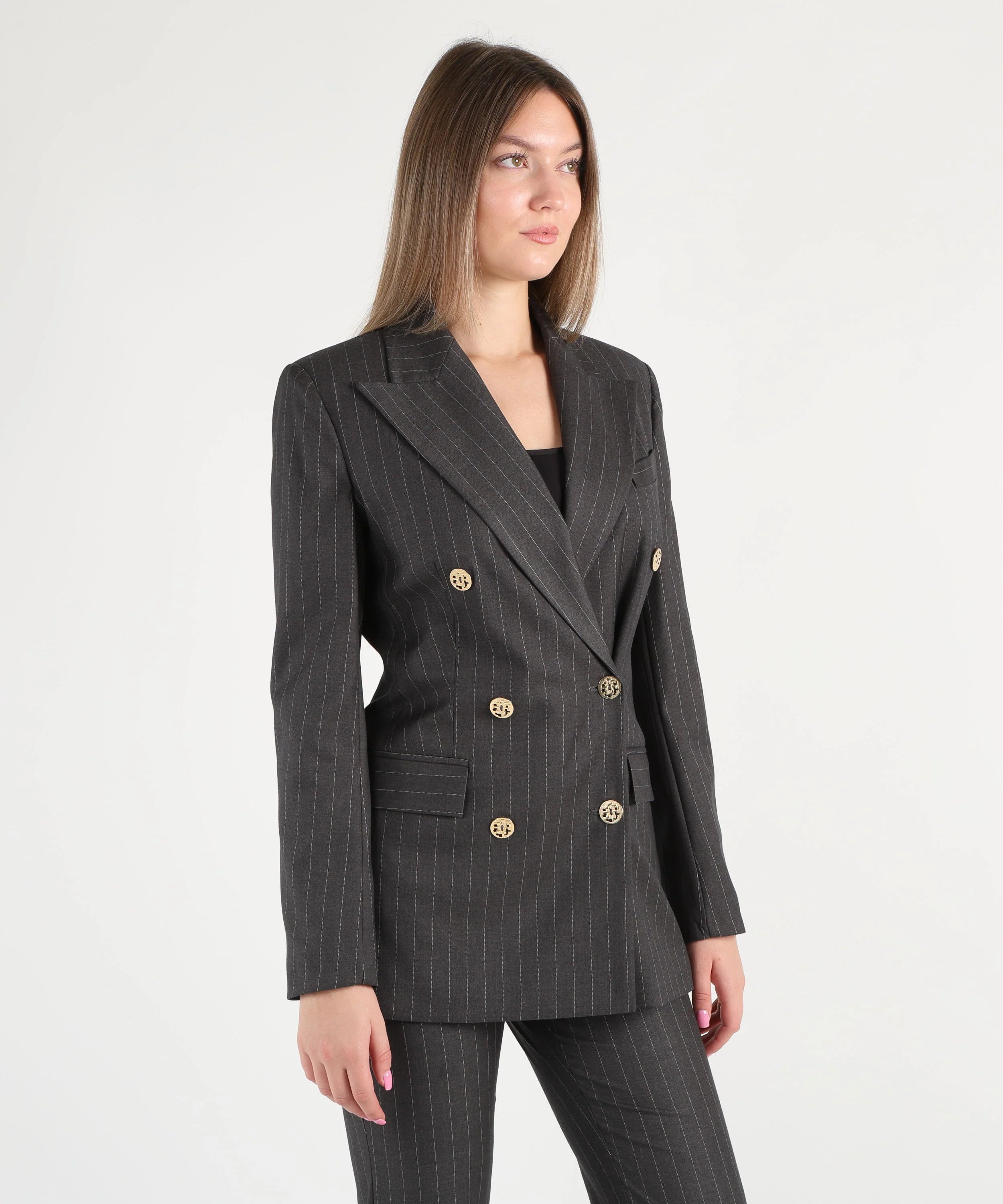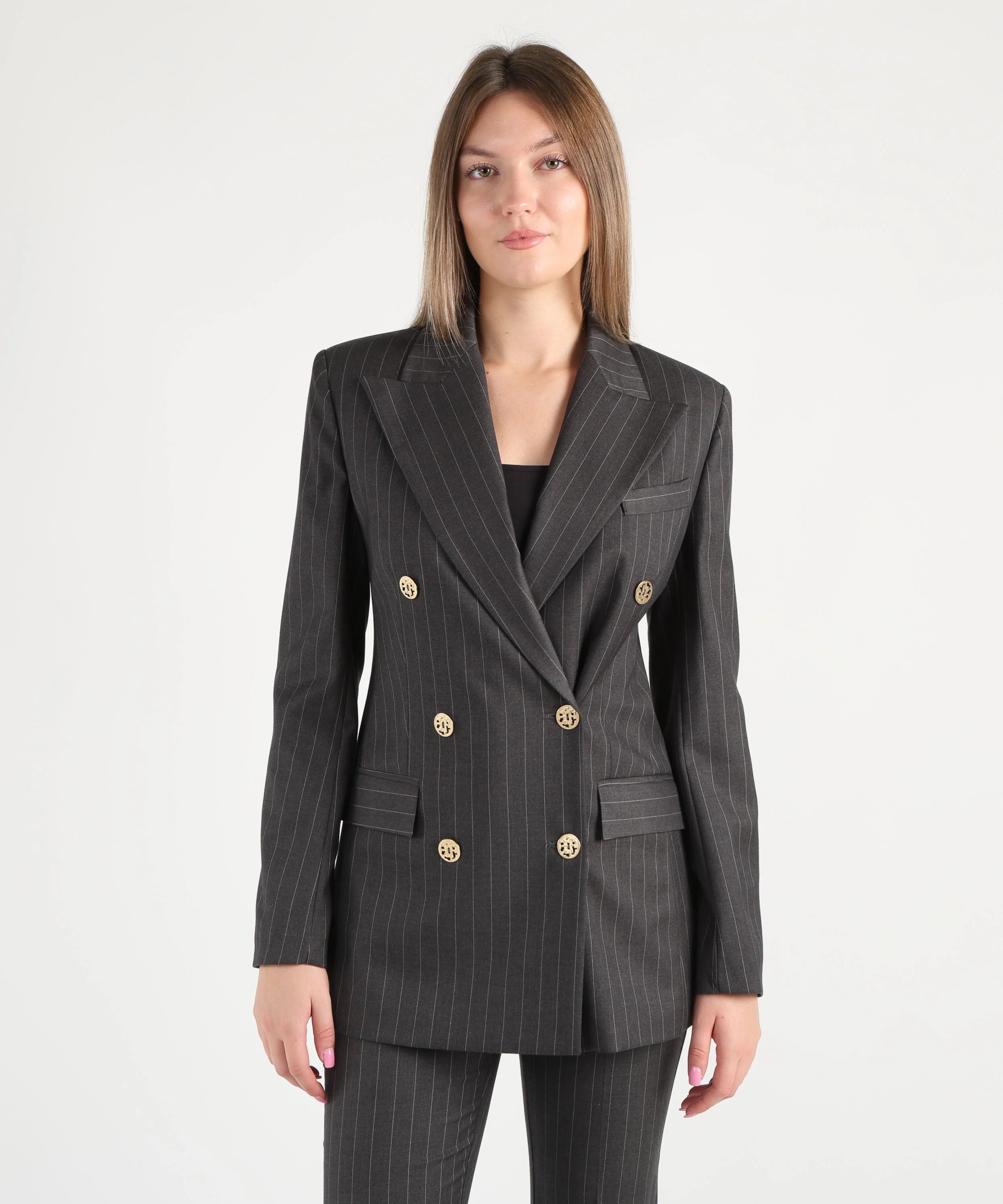 Eleganza incontrastata con un tocco di personalità! Questo blazer doppiopetto con tasche a patta e rever a lancia porta un’aura sofisticata, mentre i bottoni dorati, anche sui polsi, aggiungono quel dettaglio scintillante che fa la differenza. Perfetto per chi vuole distinguersi con stile senza prendersi troppo sul serio.