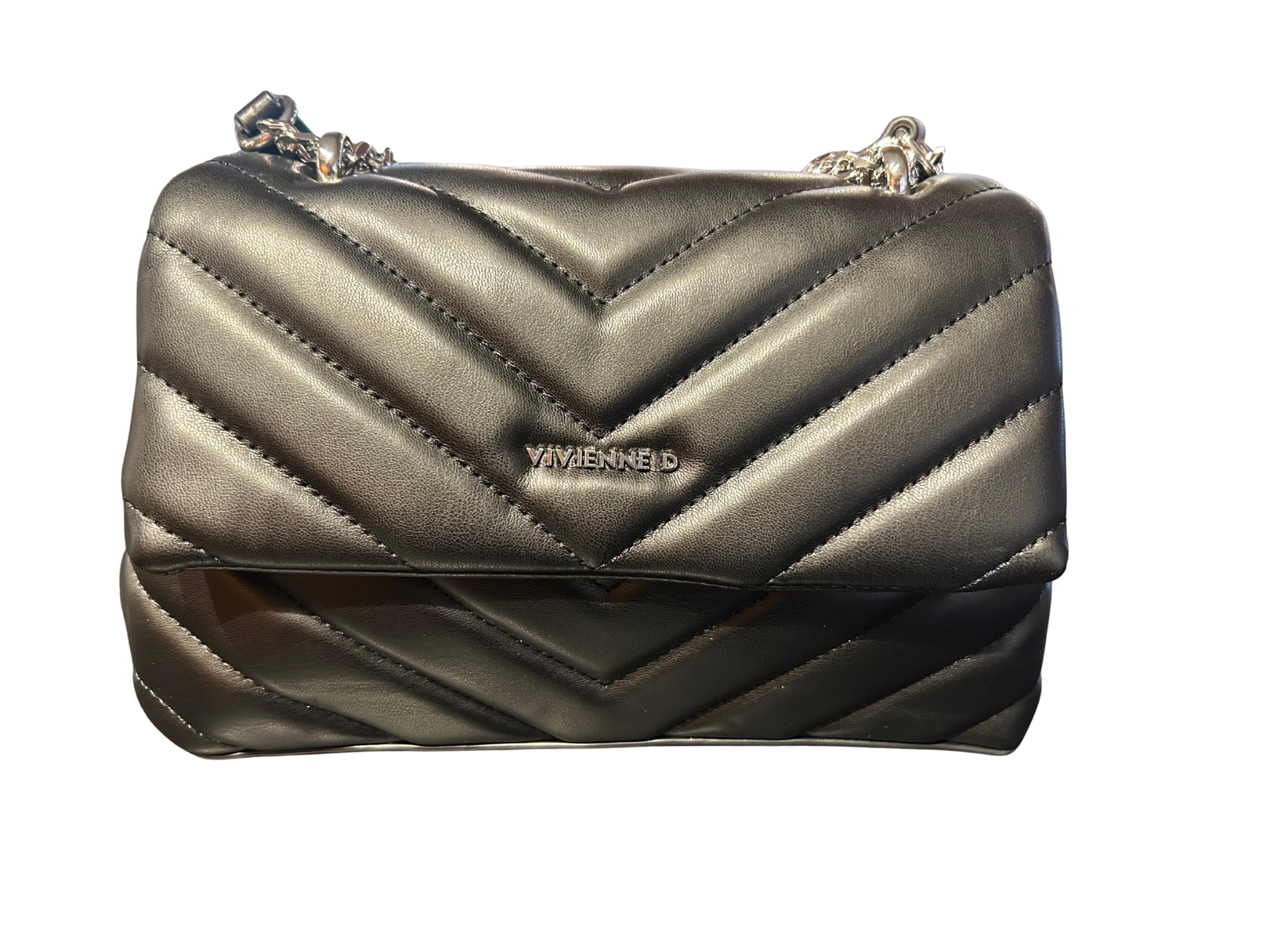Questa mini bag in ecopelle con lavorazione trapuntata è perfetta per chi ama uno stile pratico ma chic. Ha due comode tasche interne, una con zip per tenere al sicuro i tuoi piccoli tesori. Il logo VIVIENNE D in finitura argentata aggiunge un tocco di brillantezza, mentre il manico a catena scorrevole con dettaglio in ecopelle rende facile portarla sempre con te. Doppio scomparto e fodera in poliestere completano questa irresistibile compagna di avventure urbane. Dimensioni compatte (26x18x10 cm) per portare solo l’essenziale con allegria!