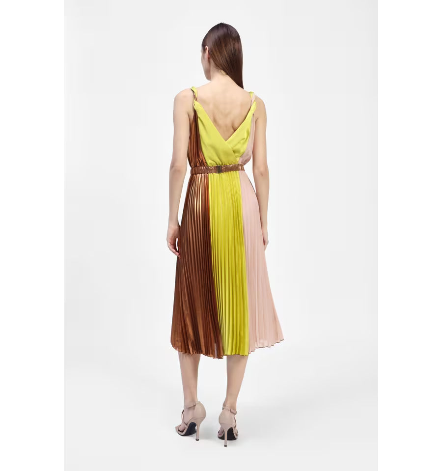 Scopri l'eleganza sofisticata di questo abito plissettato in tessuto lucido, un capolavoro che unisce movimento e luminosità. Il design multicolor cattura lo sguardo con armonia cromatica, mentre il maxi fiore applicato diventa il vostro statement piece. I plissé creano una silhouette dinamica e affascinante, perfetta per chi ama osare con stile. Ideale per occasioni speciali, cene eleganti o quando volete sentirvi semplicemente straordinarie. Un pezzo che trasforma ogni momento in un'occasione da ricordare.