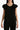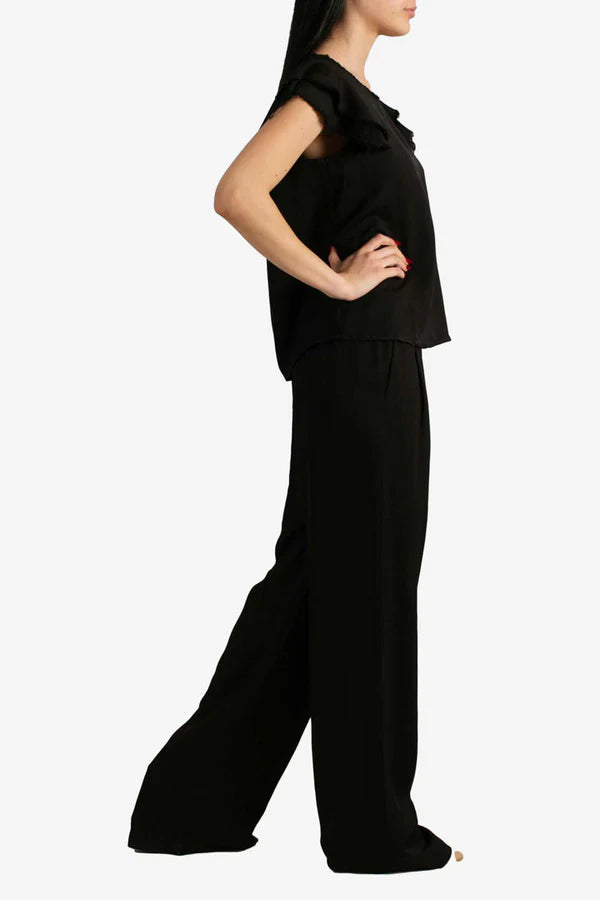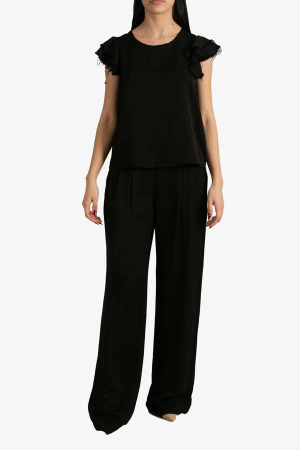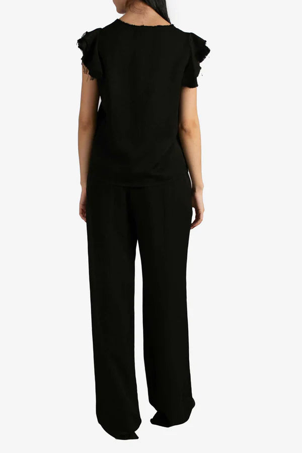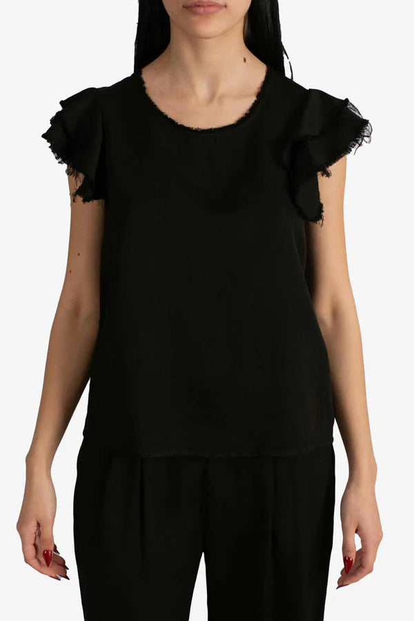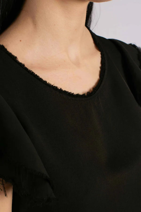Questa t-shirt nera ha un design semplice ma con dettagli che la rendono particolare. Presenta un girocollo con un bordo sfrangiato, che aggiunge un tocco di originalità e uno stile leggermente vissuto. Le maniche sono corte con un doppio strato di volant sfrangiato, che dona volume e movimento al capo. Il tessuto sembra leggero e confortevole, perfetto per un look casual ma con un tocco chic.