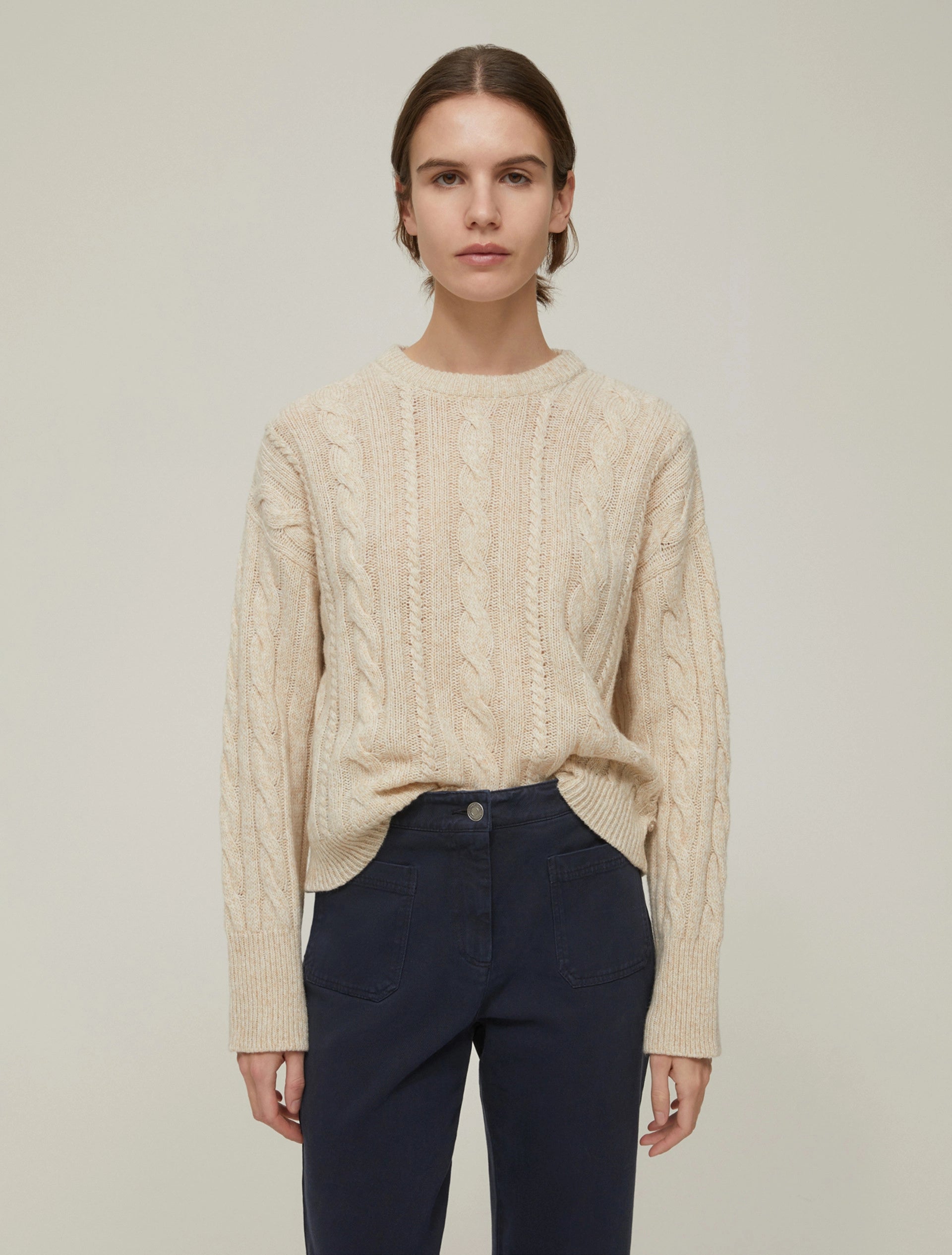 Questa maglia mouliné a trecce reinventa il classico tricot con un tocco moderno e sostenibile: realizzata con almeno il 50% di fibre riciclate, il suo blend di lana avvolge con linee ampie e diritte per un comfort sempre al top. Il mix di trecce sul davanti e sulle maniche si abbina a una schiena a coste piatte, mentre il girocollo, le spalle scese e i polsi alti danno un'allure giocosa e contemporanea. Perfetta per chi ama distinguersi con stile e attenzione all’ambiente!