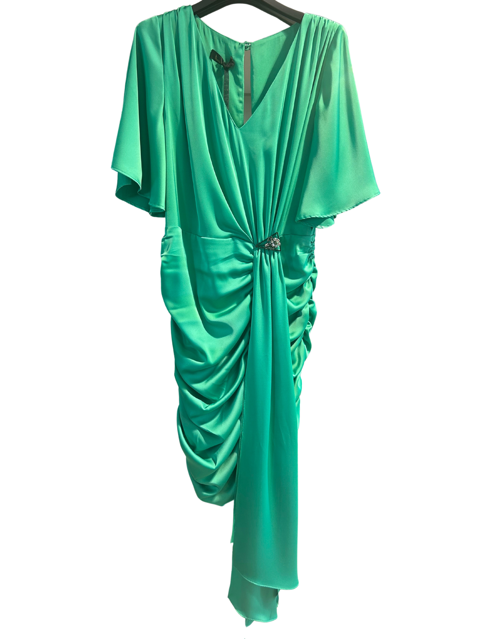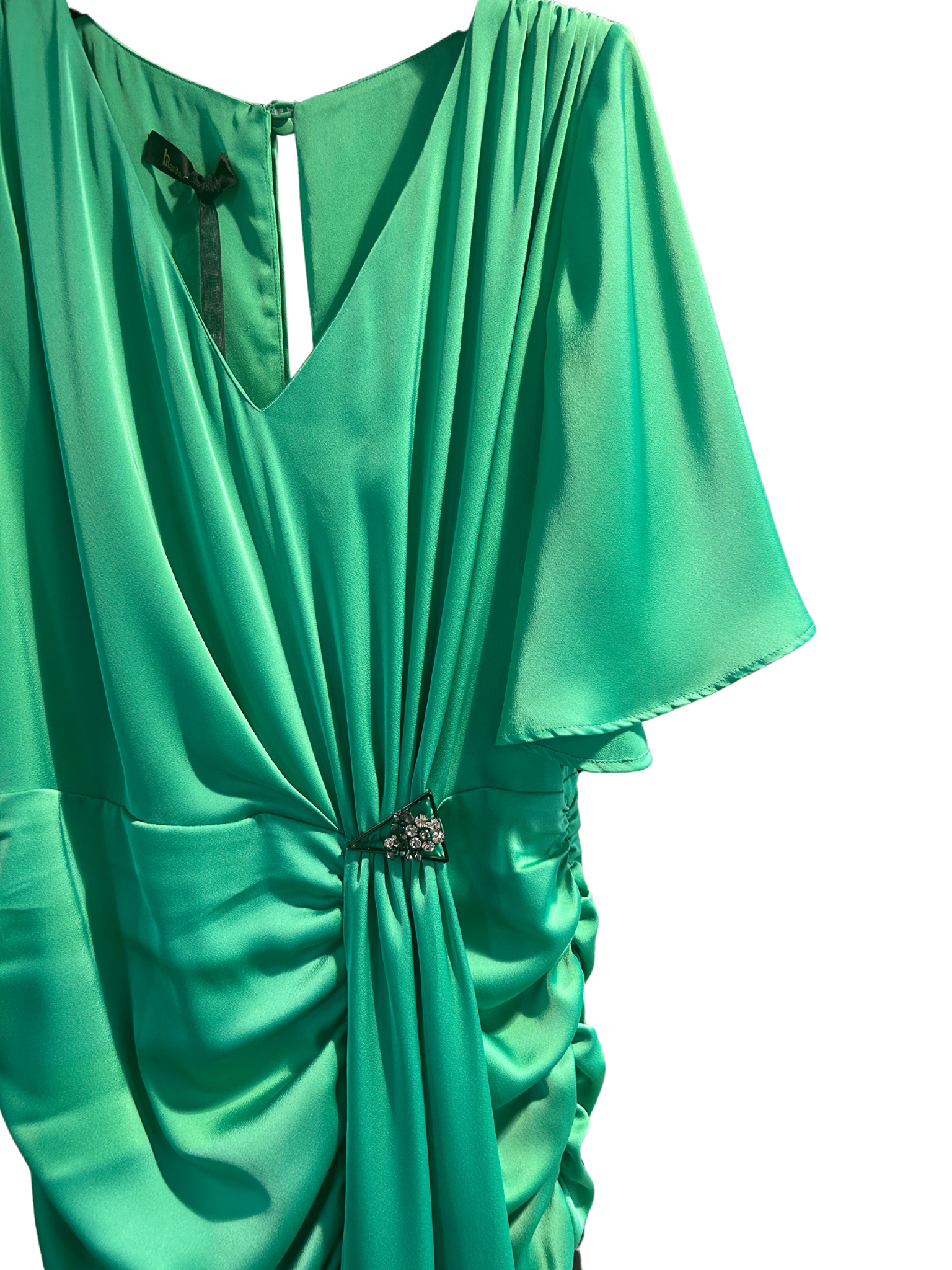 Abito corto con drappeggio di Hanita di raso di seta color verde smeraldo.