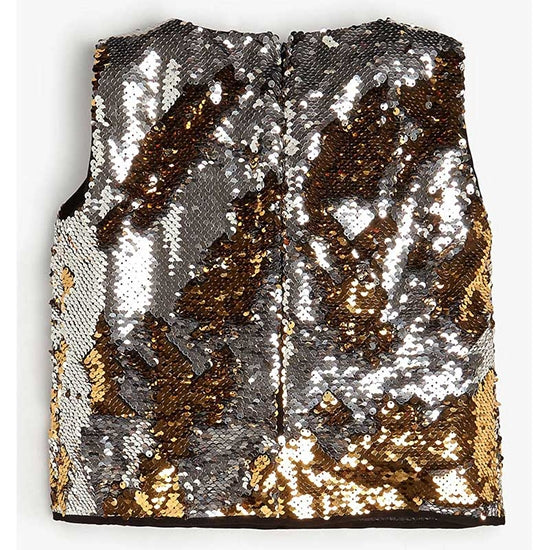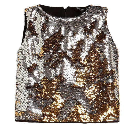 Top in paillettes per bambina firmato Guess, a trapezio, decorato con paillettes che cambiano dall'oro all'argento ed è molto voluminoso.