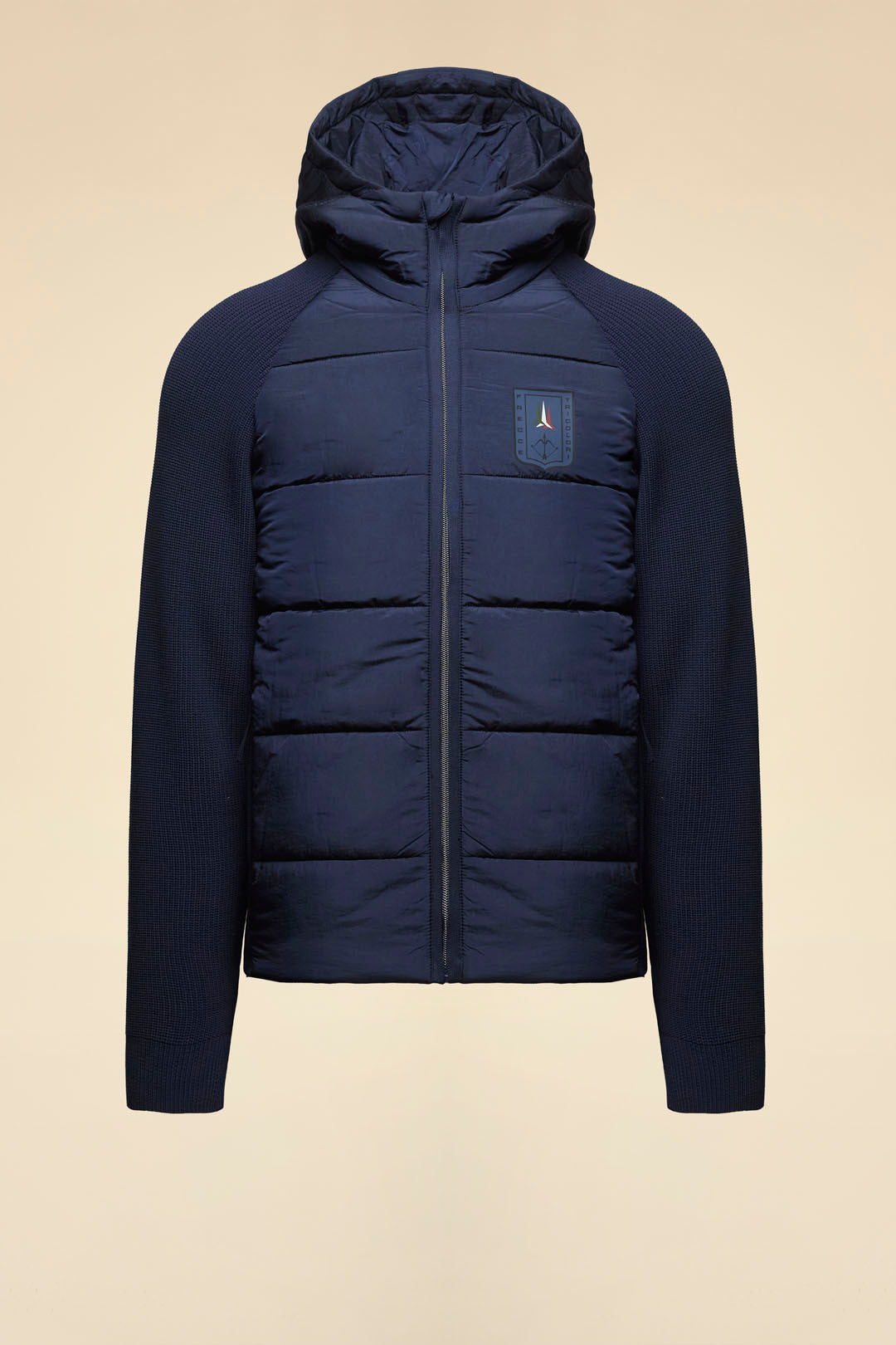 Giacca ibrida che non scherza con lo stile! Combina il calore avvolgente della maglia a costa inglese con la protezione di un tessuto tecnico imbottito e trapuntato su petto e cappuccio. Il design intelligente la rende perfetta per le giornate fresche, mentre la patch termo-applicata delle Frecce Tricolori aggiunge quel tocco di dinamismo e eccellenza che fa la differenza. Funzionalità e eleganza che si incontrano senza compromessi.