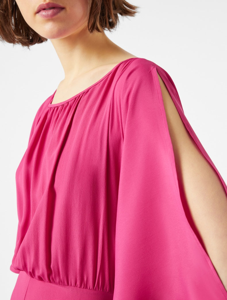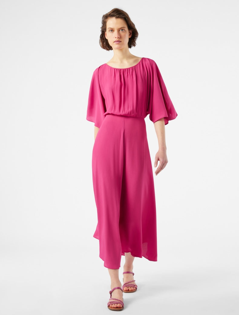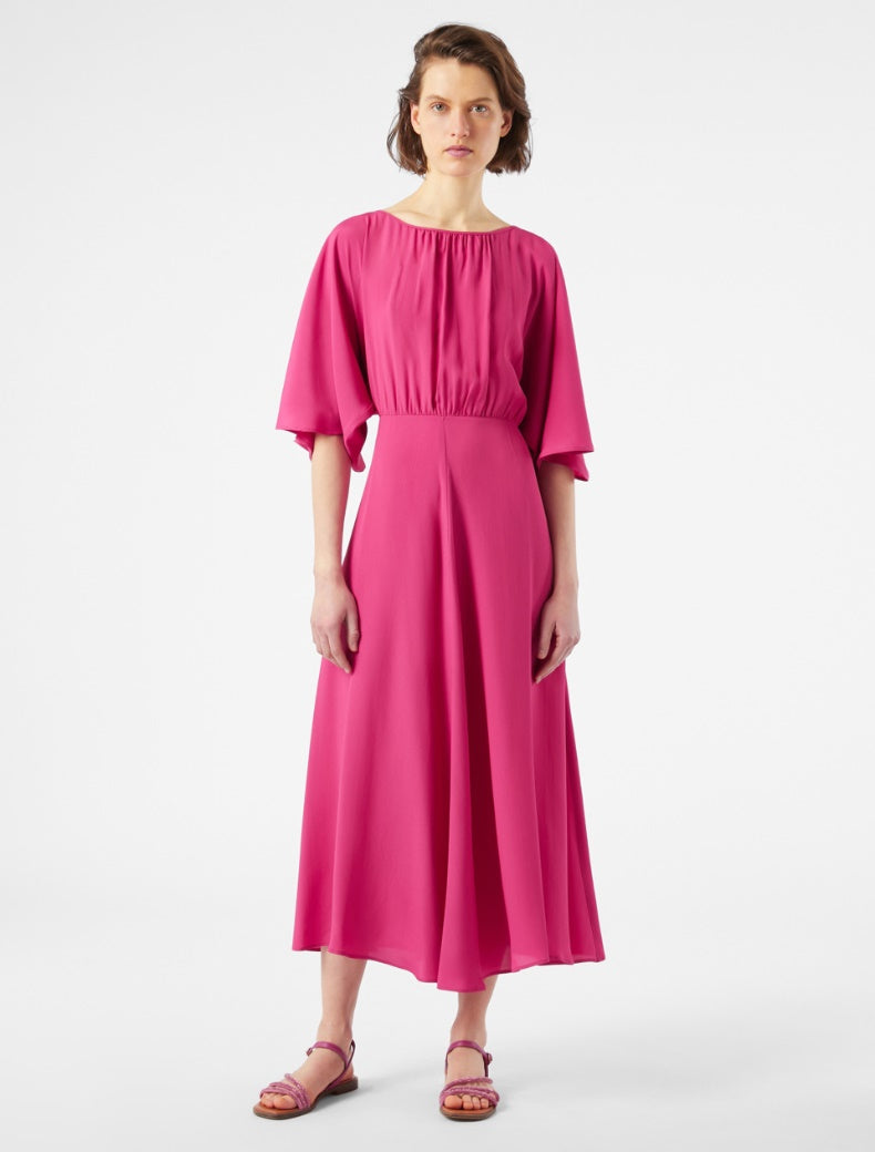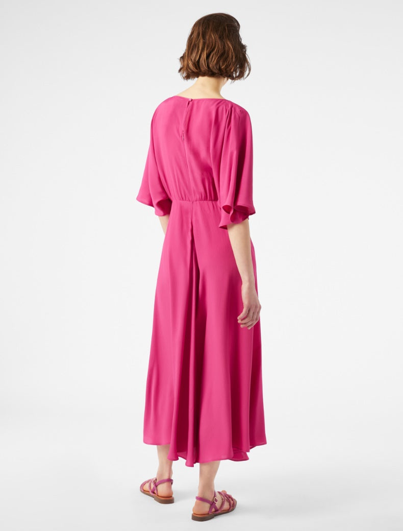 Abito lungo in blend di seta crêpe de Chine. Ha un taglio morbido con arricciature, la vita delineata da un inserto elastico e la gonna a mezza ruota. Scollo a barchetta e ampie maniche a kimono con dettaglio cut-out. Sfoderato.