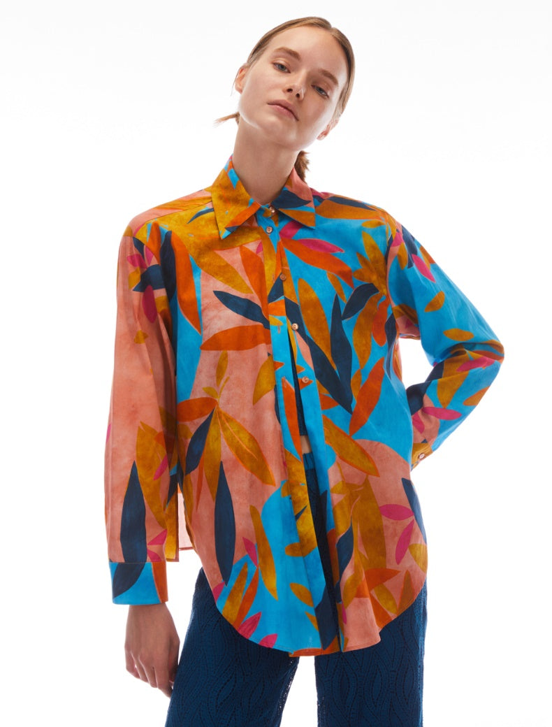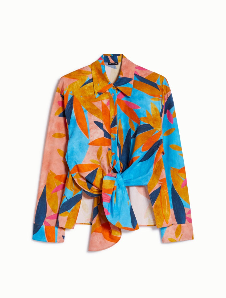 Camicia ampia in popeline di cotone a fantasia acquerellata. Si può indossare in più modi grazie ai lembi allungati sul davanti, agli spacchi laterali e a due laccetti staccabili. Annodata sul davanti, incrociata e allacciata sul retro oppure sciolta nella sua silhouette diritta, sarà sempre perfetta.