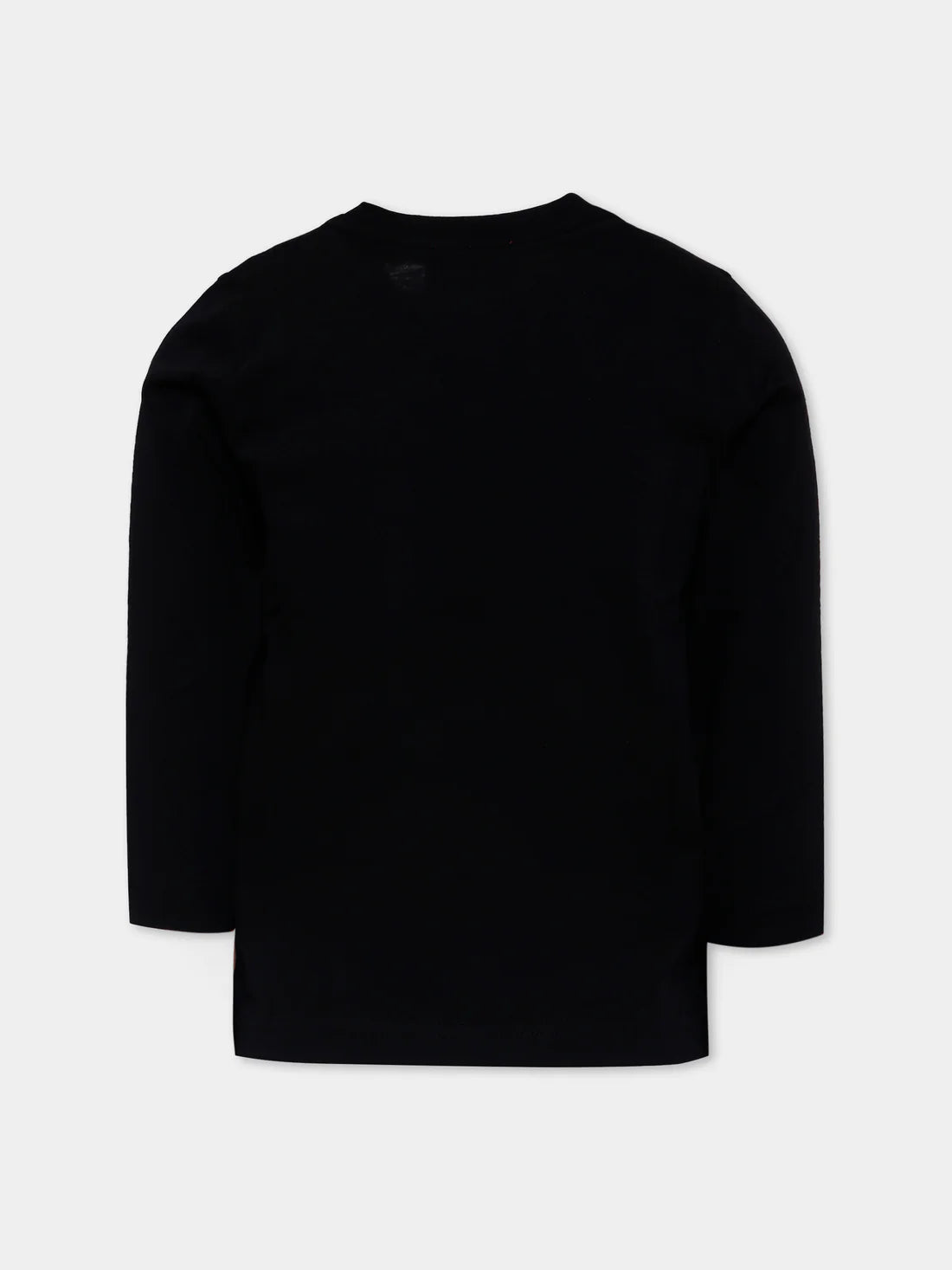 Perfetta per i piccoli fashionisti! Questa t-shirt nera in puro cotone è il capo essenziale della stagione. Le maniche lunghe e il girocollo a costine garantiscono comfort e praticità, mentre il logo stampato sulla parte anteriore aggiunge quel tocco di stile inconfondibile. Morbida, resistente e facile da lavare, è la scelta ideale per il guardaroba autunnale dei bambini. Un classico che non passa mai di moda!