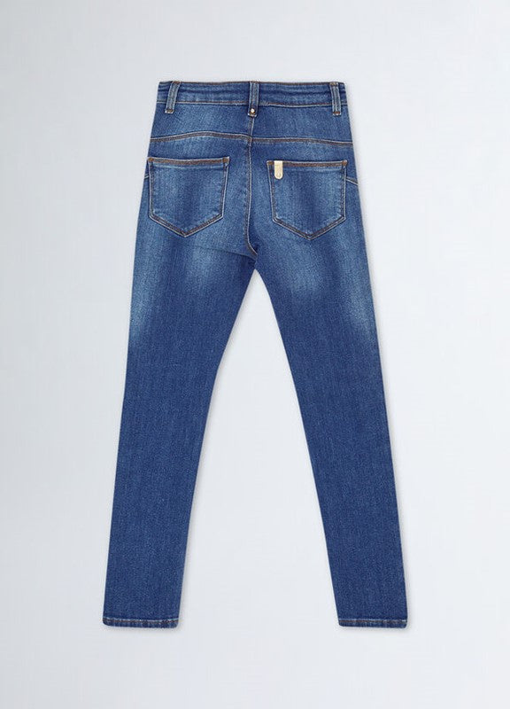 Jeans LIU JO che catturano lo spirito del denim contemporaneo. Realizzati in misto cotone stretch per una vestibilità confortevole e una silhouette che si adatta perfettamente al tuo corpo. Il lavaggio used conferisce quel tocco vintage e ricercato, mentre la vita alta esalta le proporzioni e regala un look sofisticato. Il classico modello a cinque tasche garantisce praticità, completato dal dettaglio del logo in metallo sul retro che firma il capo con stile. La chiusura con zip nascosta e bottone assicura un finish impeccabile e una comodità senza compromessi.