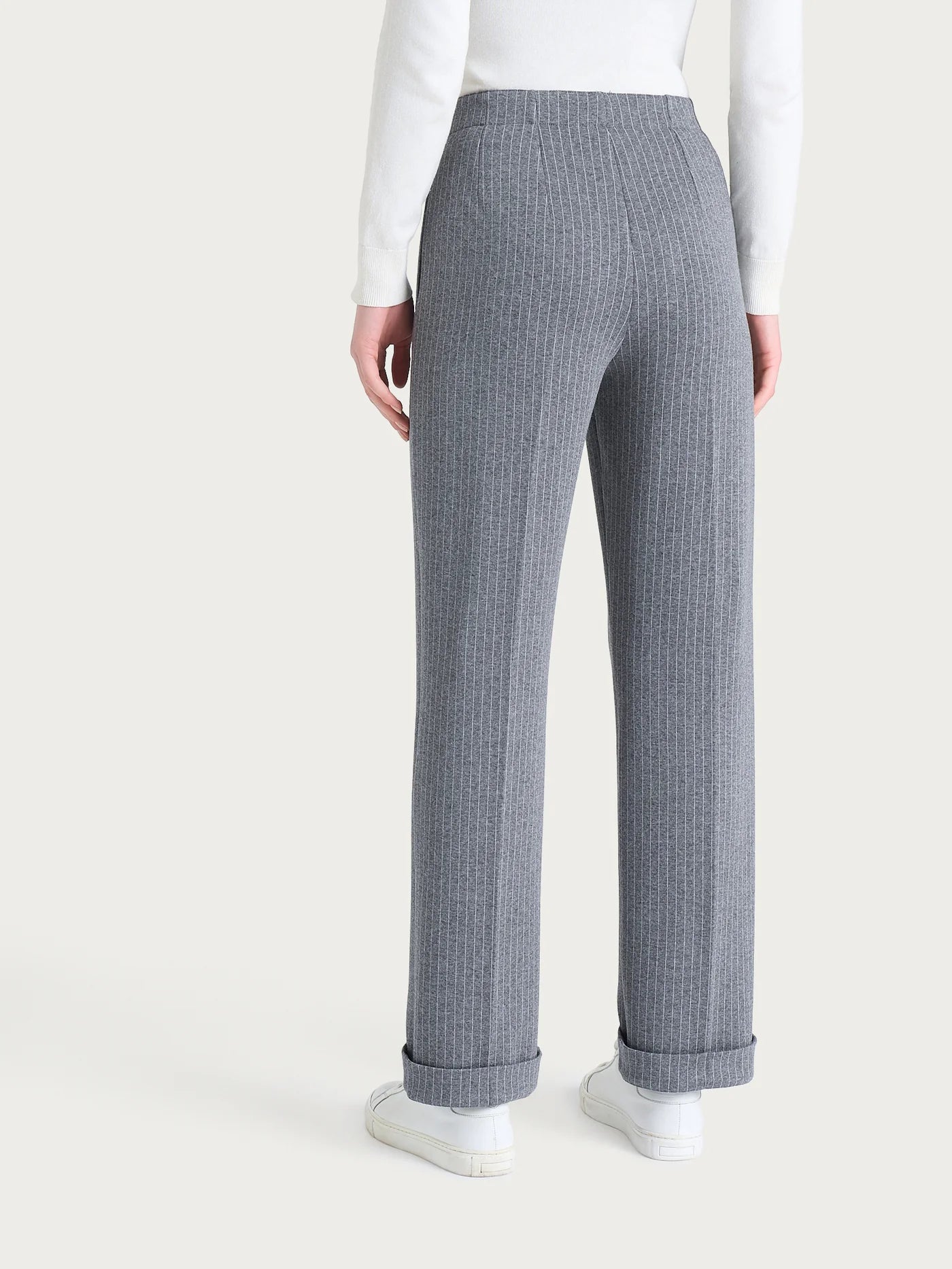 Pantalone lungo da donna a gamba dritta che unisce stile e praticità! Questo modello gessato con sottili righe verticali vanta una vita elasticizzata senza zip e comode tasche laterali. Il risvolto regolabile ti permette di personalizzare il look secondo il tuo stile. Realizzato in Eco Jacquard, un tessuto innovativo che combina la stabilità della navetta con l'elasticità della maglia, garantisce comfort e eleganza per ogni occasione. Semplice da indossare, perfetto per chi ama il comfort senza compromessi!