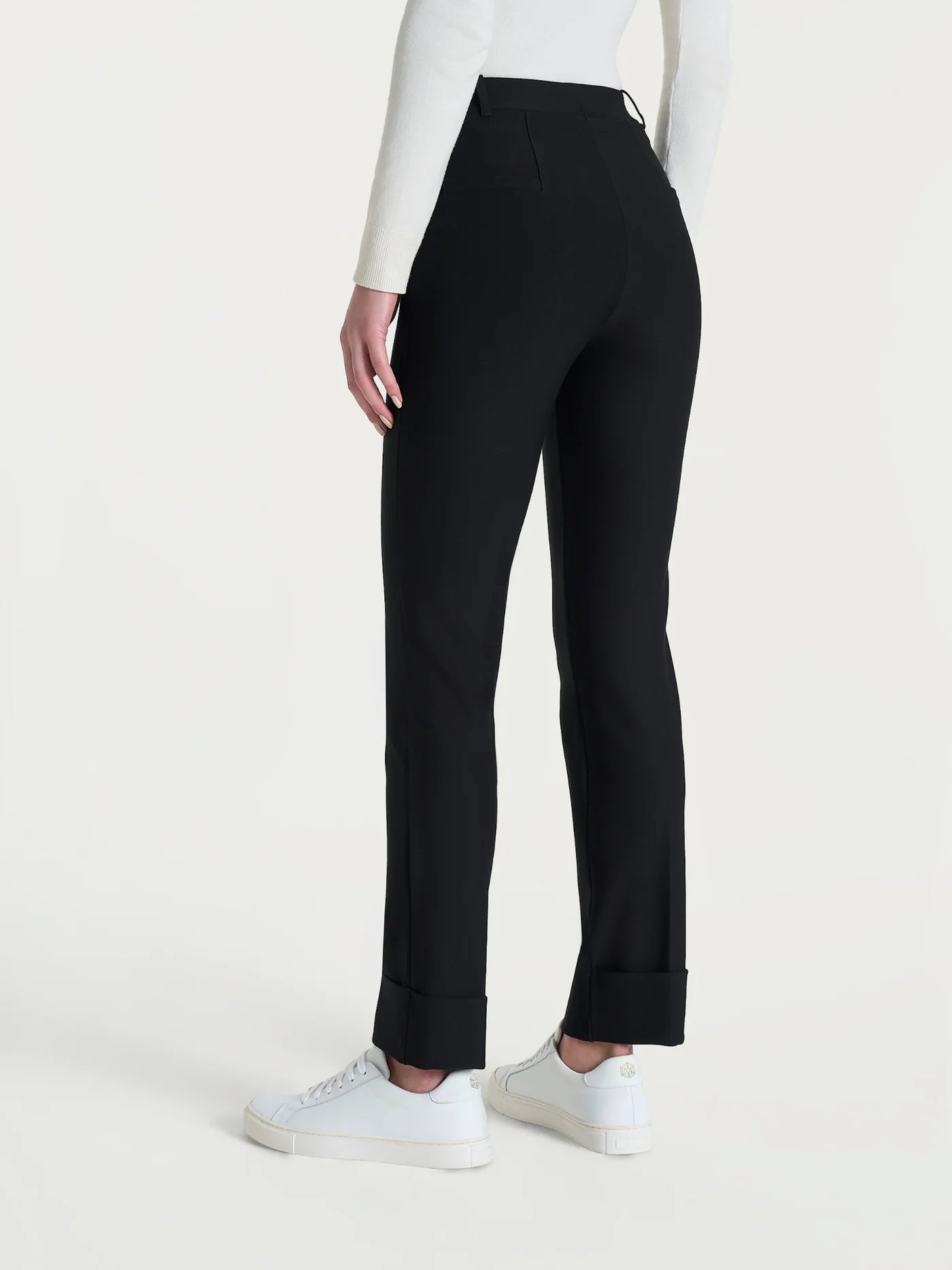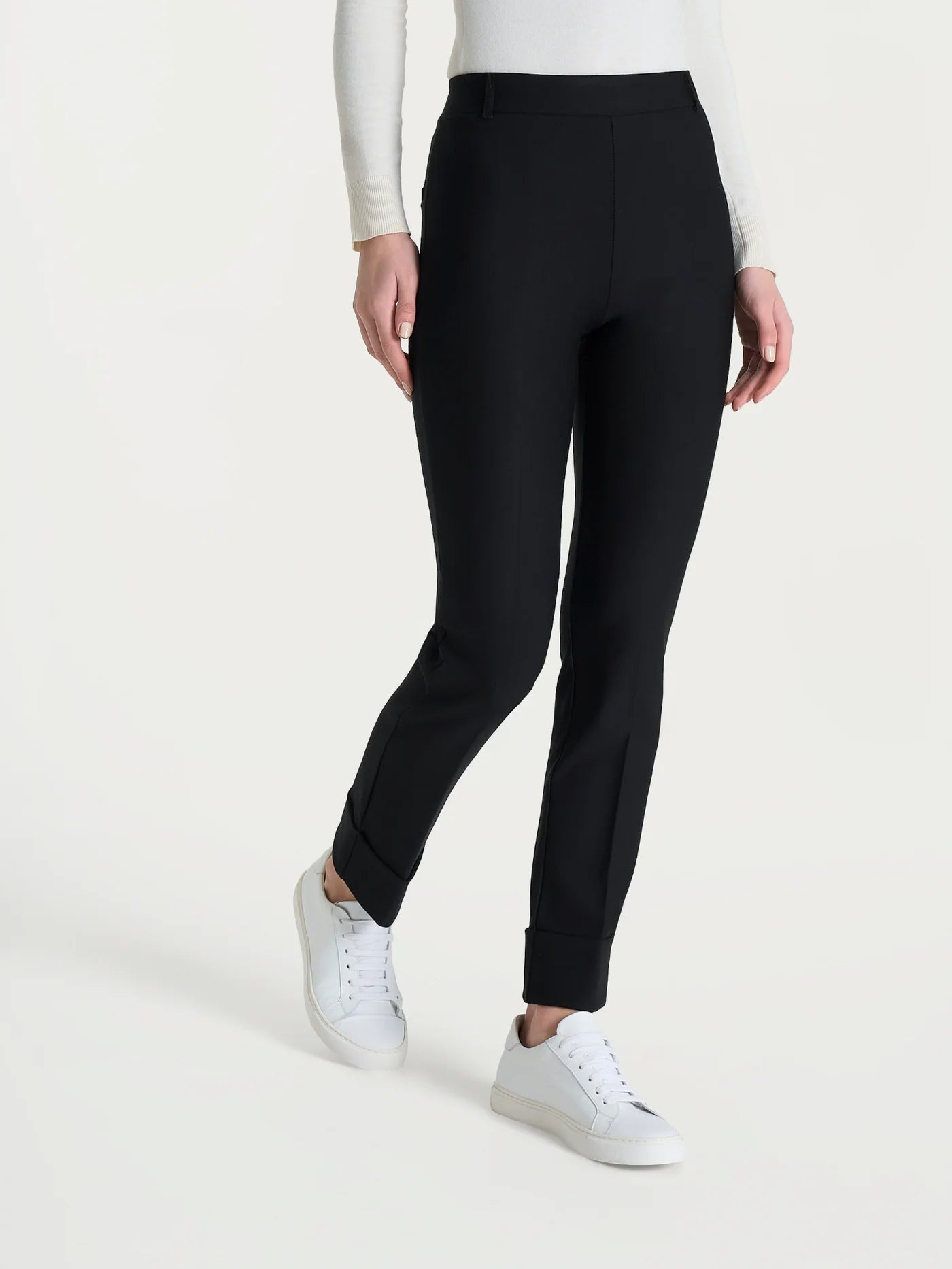 Pantalone slim dritto che unisce praticità e eleganza senza compromessi. La vita elasticizzata garantisce comfort tutto il giorno, mentre i passanti per la cintura ti permettono di personalizzare il look con accessori che ami. Senza tasche funzionali ma con tasche posteriori sapientemente disegnate, mantiene una silhouette impeccabile. Il delicato risvolto fisso sul fondo aggiunge quel dettaglio raffinato che fa la differenza. Perfetto per chi non vuole rinunciare allo stile, nemmeno per un secondo.