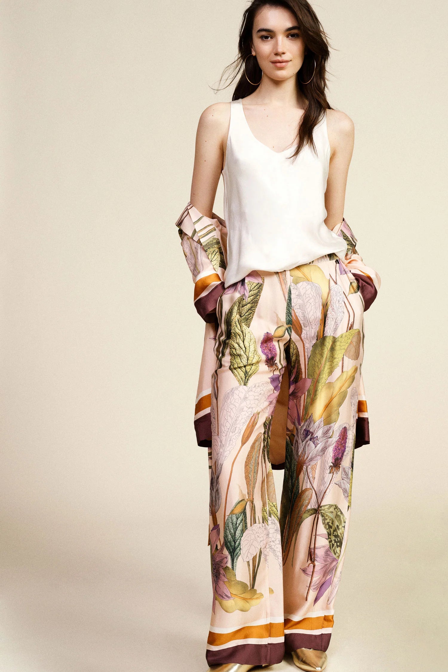 Scopri un pantalone palazzo che valorizza la femminilità con il suo design ampio e leggero. La stampa botanica dona originalità e carattere, mentre la vita alta esalta la silhouette e permette abbinamenti versatili. Ideale per chi ama i dettagli ricercati e vuole sentirsi unica in ogni occasione del quotidiano.