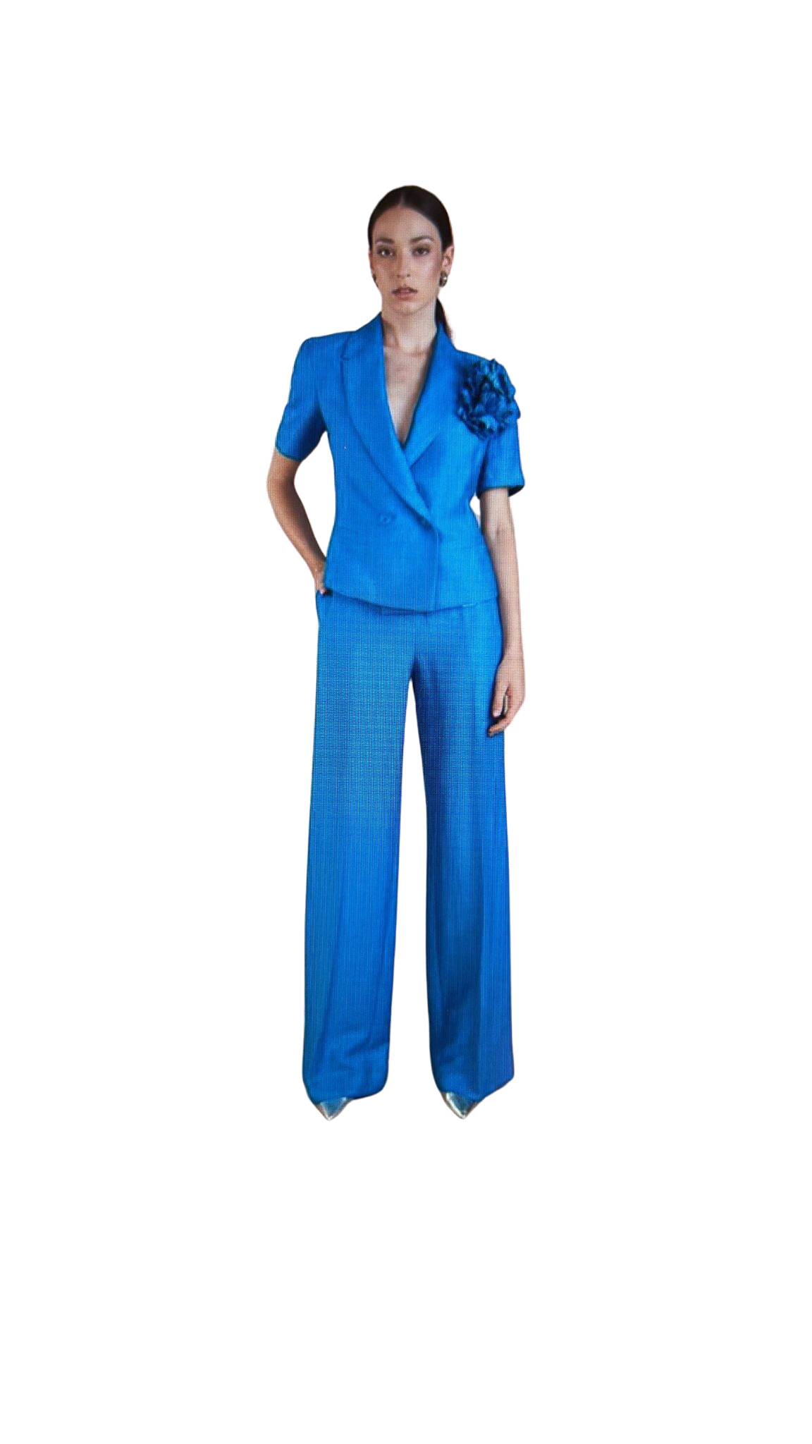 # TAILLEUR KAOS Eleganza senza compromessi con il nostro tailleur Kaos in turchese acceso. Un capo che gioca con la semplicità: linee pulite, colore vibrante e zero fronzoli. Perfetto per chi sa che il vero stile non ha bisogno di spille per brillare. Indossalo per un look contemporaneo che parla da solo, dal lavoro agli aperitivi con stile. Versatile, audace, irresistibile.