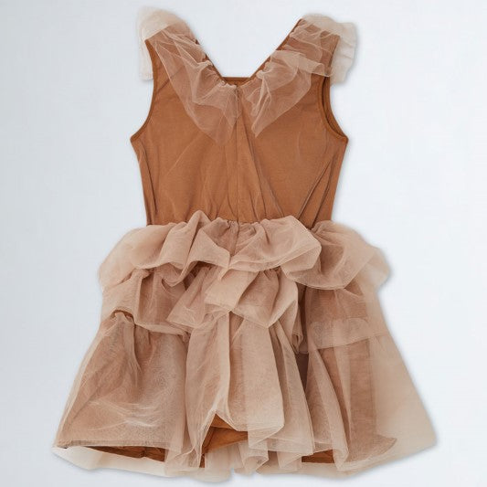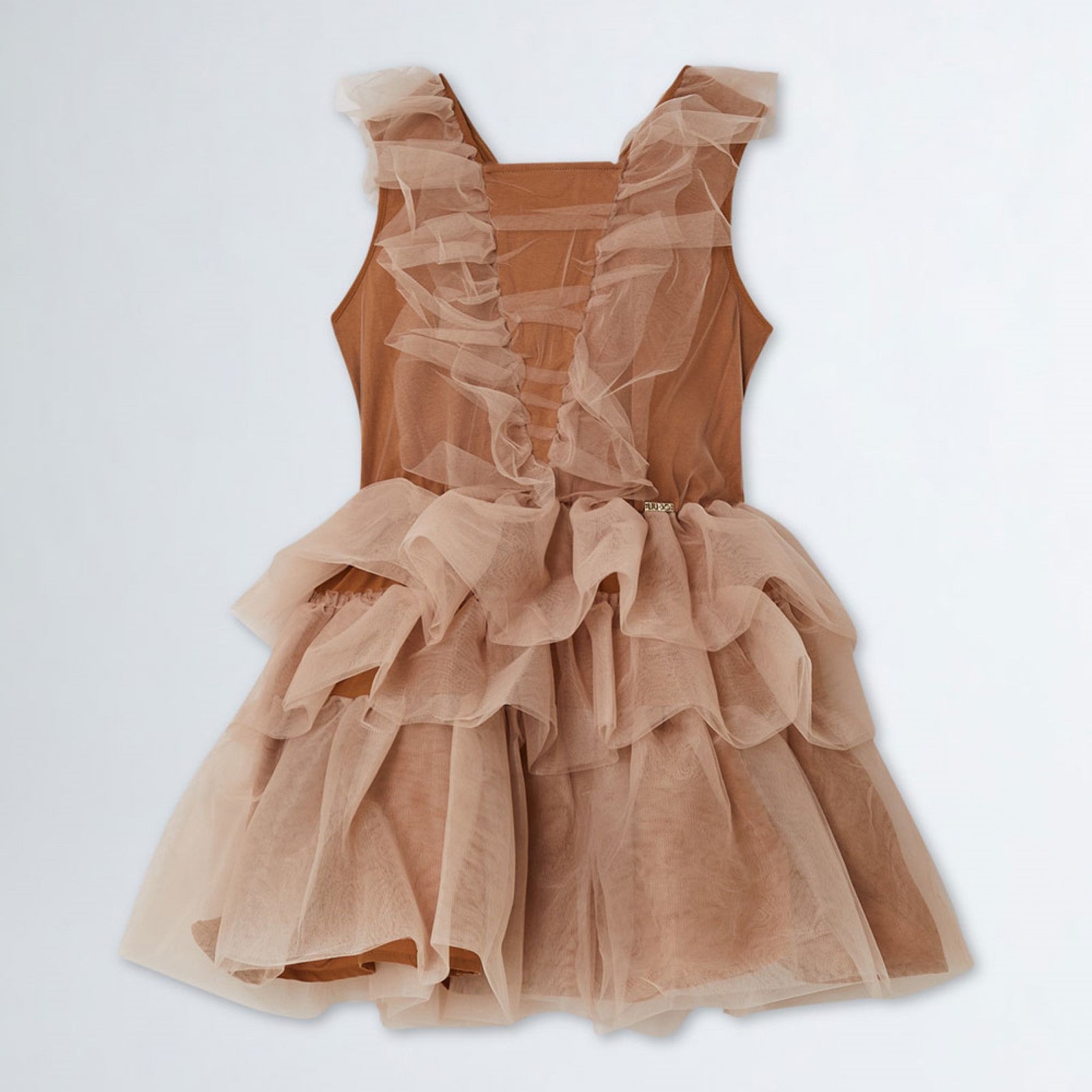 Vestito da bambina in tulle. Scollo rotondo. Sorretto da spalline larghe. Chiusura con zip sul retro.